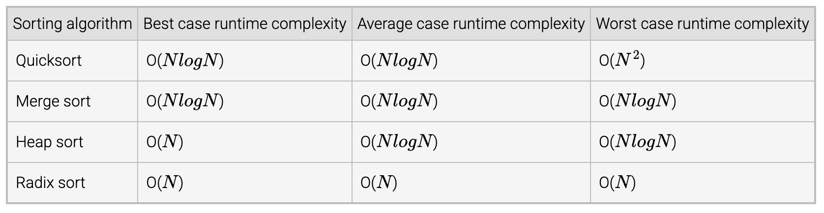 These are the best, average, and worst case runtime complexity of the 4 fast sorging algorithms.