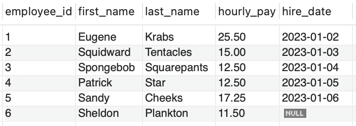 여섯번째 행의 데이터, Plankton 데이터의 시급과 취직 날짜가 NULL 인 것을 볼 수 있습니다.