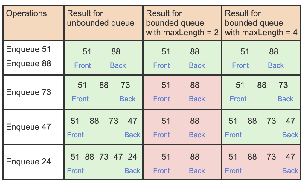 Again, similar to Stack we can use a flexible approach by using max_length for both bounded and unbounded queues, but differentiate based on its sign.