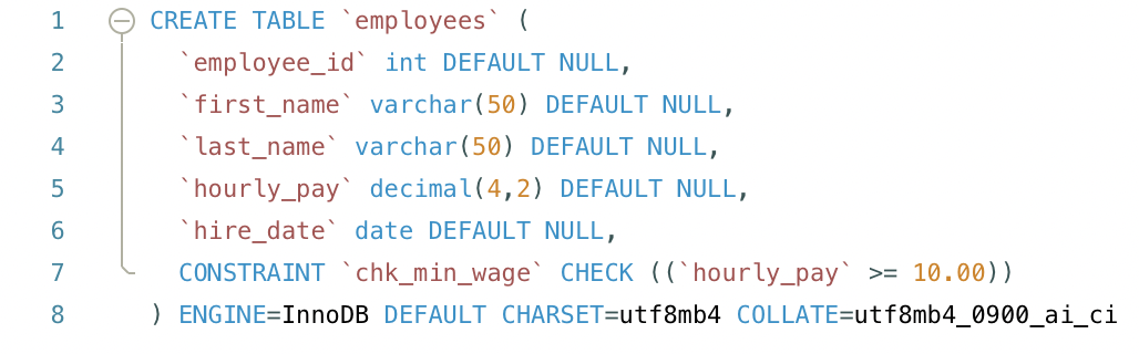 CONSTRAINT chk_min_wage CHECK (hourly_pay >= 10.00)