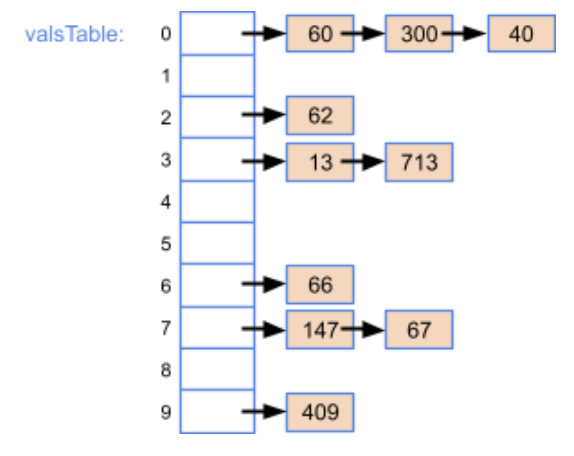 Ex. Given an array with indices 0 ... 9 to store integers from 0 ... 5000, the modulo (remainder) operator can b usd to map 25 to index 5 (25 % 10 = 5), and 149 to index 9 (149 % 10 = 9).