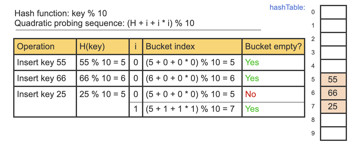 This is an example of inserting 3 items into a hash table with quadratic probing, using c1 = c2 = 1.