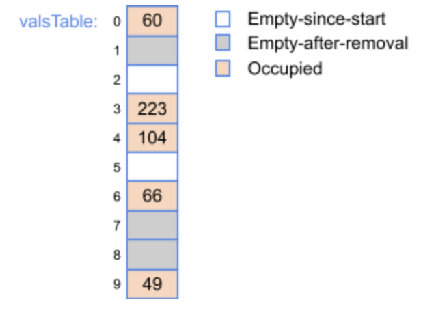 From valsTable hash table, after removing 66 via HashRemove(valsTable, 66),