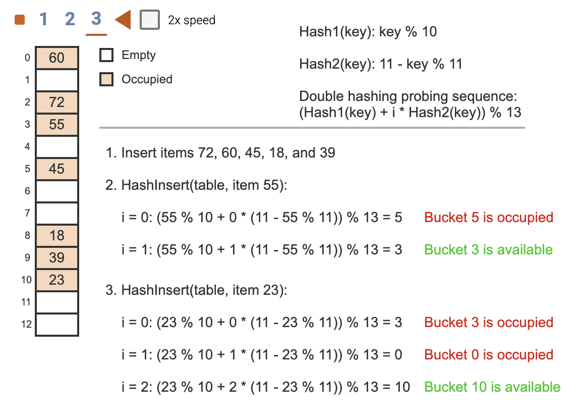 Inserting a key uses the formula, starting with 𝑖 = 0, repeatedly search hash table buckets until an empty bucket is found.