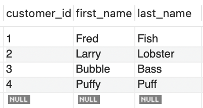 customers table consists of 3 columns: customer_id (PRIMARY KEY), first_name, last_name