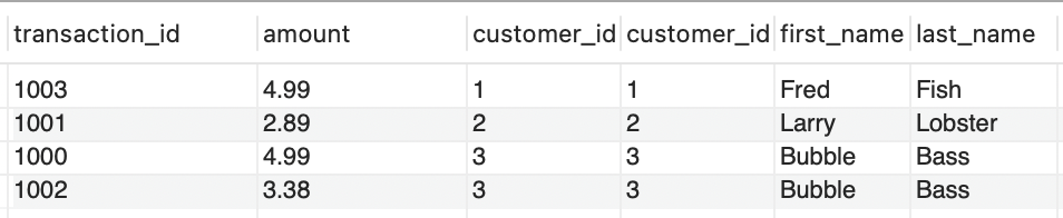 Notice that the row with transaction_id = 1004 from transactions table and the row with the name "Puffy" "Puff" in customers table is not included in the INNER JOIN table, because those rows doesn't share common customer_id data in both table.