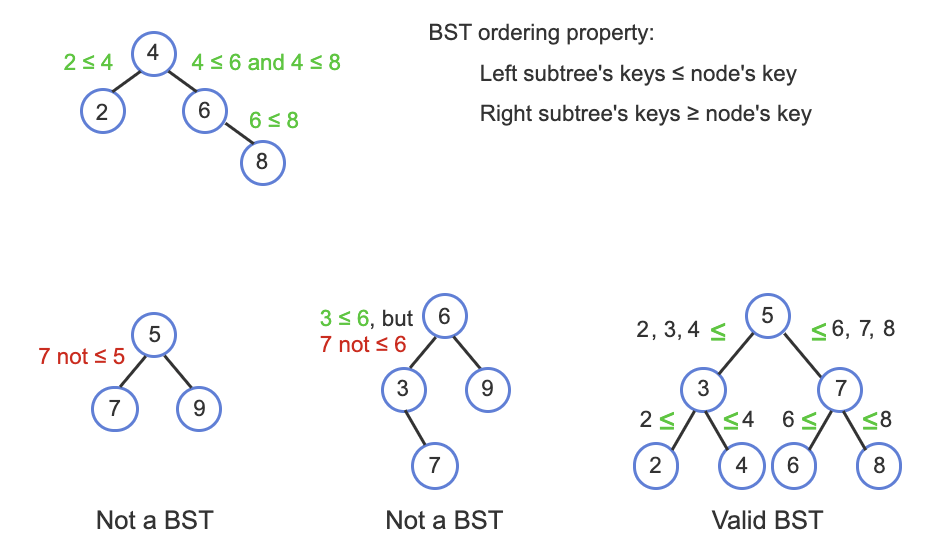 BST has an ordering property that any node's left subtree keys ≤ the node's key and the right subtree's keys ≥ the node's key.