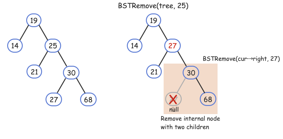 - Remove an internal node with two children: This case is the hardest. First, the algorithm locates X's successor (the leftmost child of X's right subtree), and copies the successor to X. Then, the algorithm recursively removes the successor from the right subtree.