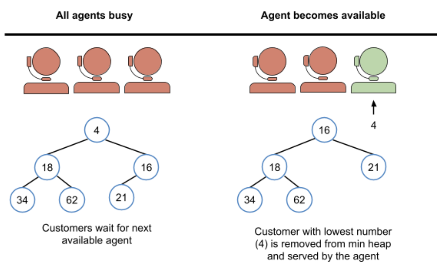 Min-heap이 자주 사용되는 분야 중 하나는 customer services 입니다. 많은 customer services queue 시스템은 먼저 대기중인 고객 또는 긴급하거나 우선순위가 있는 고객에게 더욱 낮은 값을 부여합니다. 이후 고객 응대가 가능한 직원이 생겼을 때, 가장 낮은 값 (root node)을 가지는 대기 손님부터 우선적으로 상담을 시작하는 식입니다.