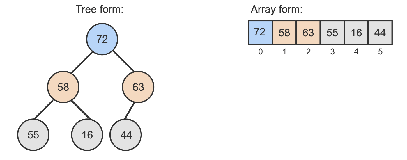Heaps are typically stored using arrays. Given a tree representation of a heap, the heap's array form is produced by traversing the tree's levels from left to right and top to bottom.