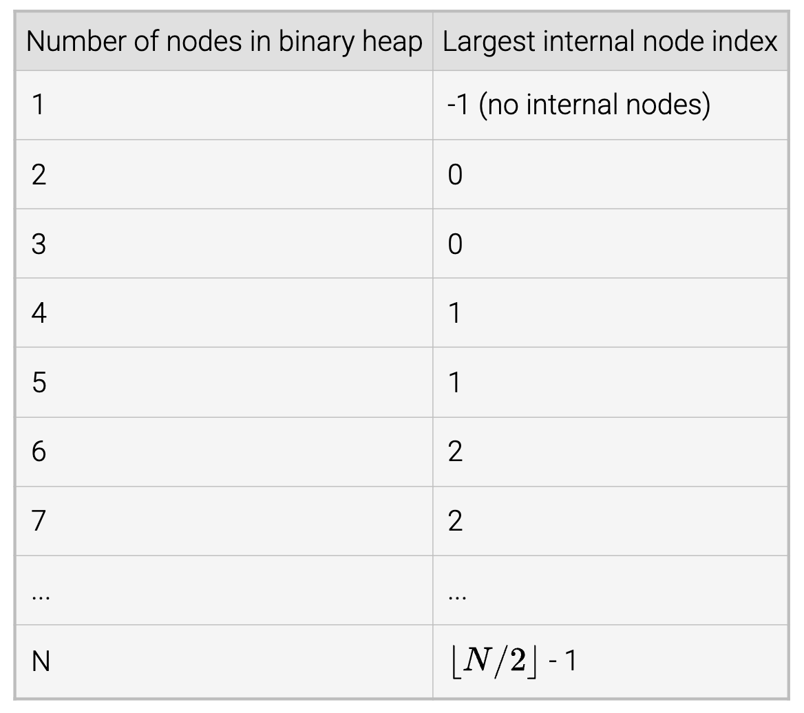 Given a binary tree with N nodes, the largest internal node index is ⌊N/2⌋ - 1.