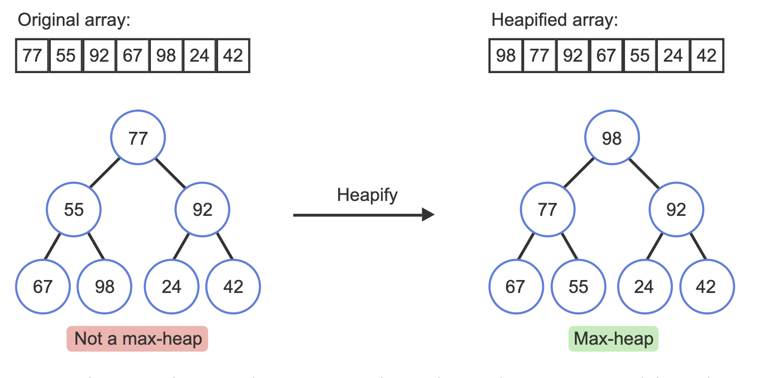 Heapsort is a sorting algorithm that takes advantage of a max-heap's properties by repeatedly removing the max and building a sorted array in reverse order. An array of unsorted values must first be converted into a heap. The heapify opeartion is used to turn an array into a heap. Since leaf nodes already satisfy the max heap property, heapifying to build a max-heap is achieved by percolating down on every non-leaf node in reverse order.