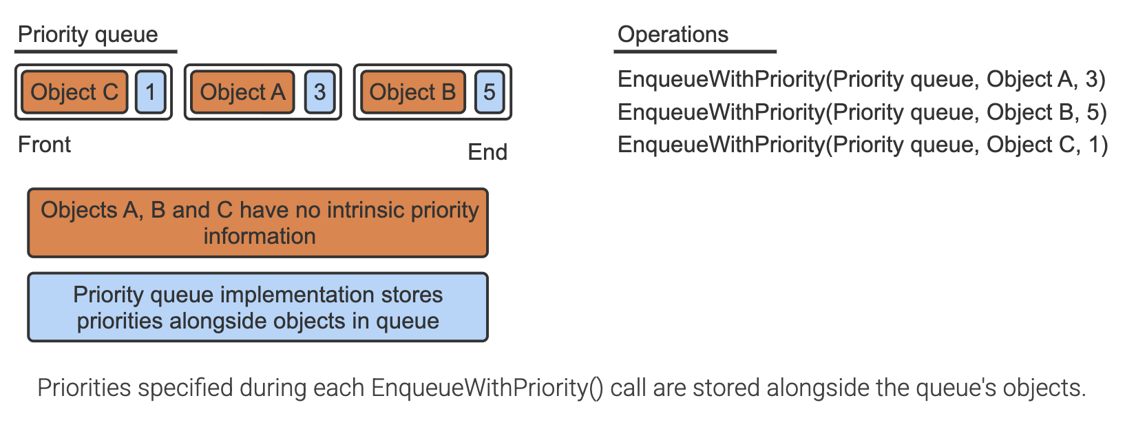 A priority queue may also be implemented such that all properties are specified during a call to EnqueueWithPriority: An enqueue opeariton that includes an argument for the enqueued item's priority.