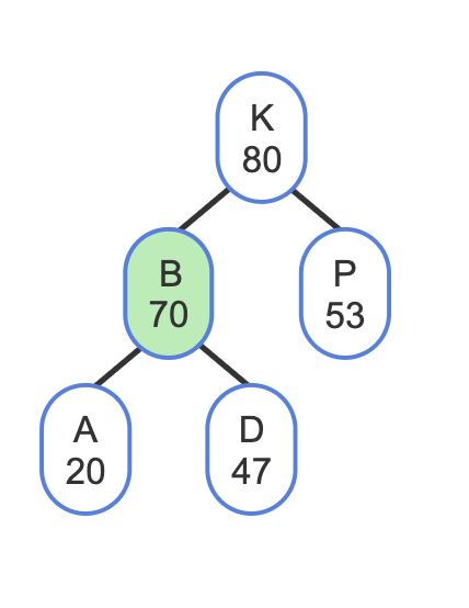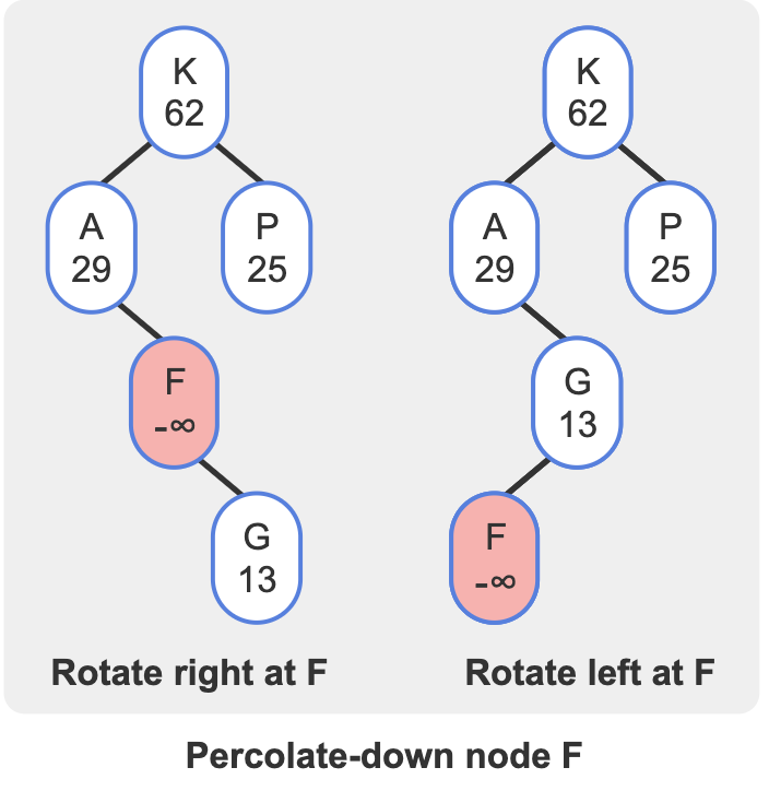 A treap delete could be done by first doing a BST delete (copying the successor to the node-to-delete, then deleting the original successor), followed by percolating the node down until the heap property is not violated. However, a simpler approach just sets the node-to-delete's priority to -∞ (for a max-heap), percolates the node down until a leaf, and removes the node. Percolating the node down uses rotations, not swaps, to maintain the BST property. Also, the node is rotated in the direction of the lower-priority child, so that the node rotated up has a higher priority than that child, to keep the heap property.