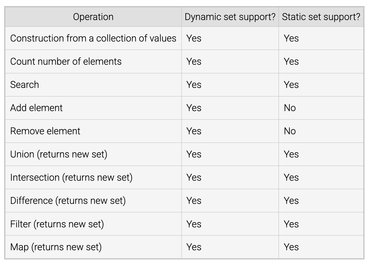 Static sets support most set opeartions by returning a new set representing the operation's result. The table below summarizes the common opeartions for each set.