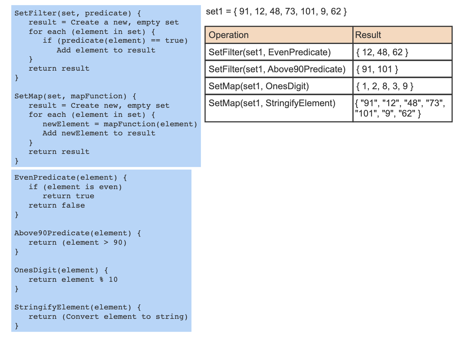 A map oepartion on X produces a new set by applying some function F to each element. (Ex. If X = {18, 44, 38, 6} and F is a function that divides a value by 2, then SetMap(X, F) = {9, 22, 19, 3})