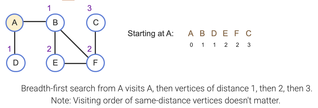 A breadth-first search (BFS) is a traversal that visits a starting vertex, then all vertices of distance 1 from that vertex, then of distance 2, and so on, without revisiting a vertex.