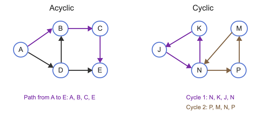 - A cycle is a path that starts and ends at the same vertex. A directed graph is cyclic if the graph contains a cycle, and acyclic if the graph doesn't contain a cycle.