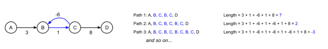 A shortest path doesn't exist in a graph with a negative edge weight cycle, because each loop around the negative edge weight cycle further decreases the cycle length, so no minimum exists. (minimum = -∞)