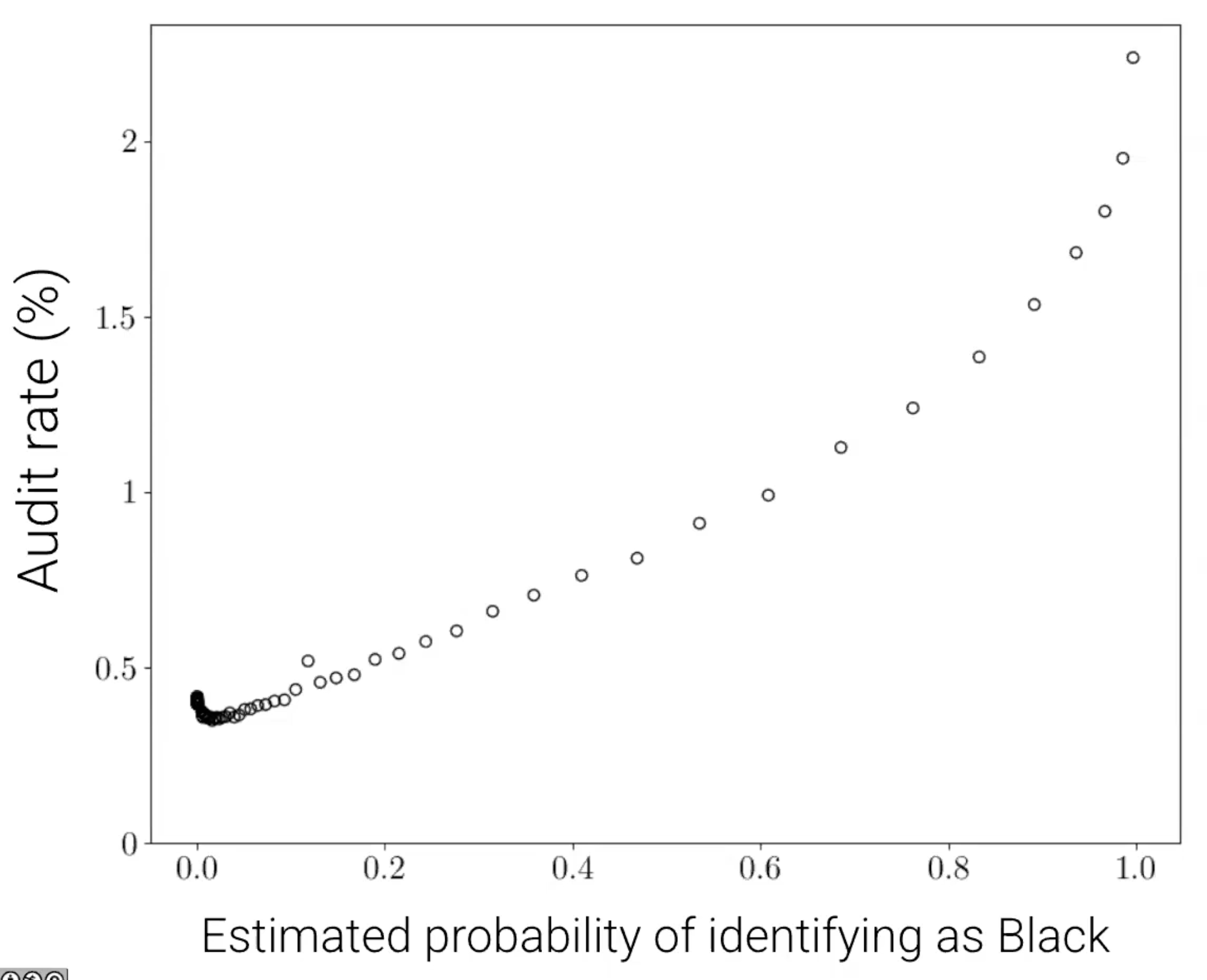 Then the result graph showing the audit rate against estimated probability of identifying as Black shows a strong pattern.