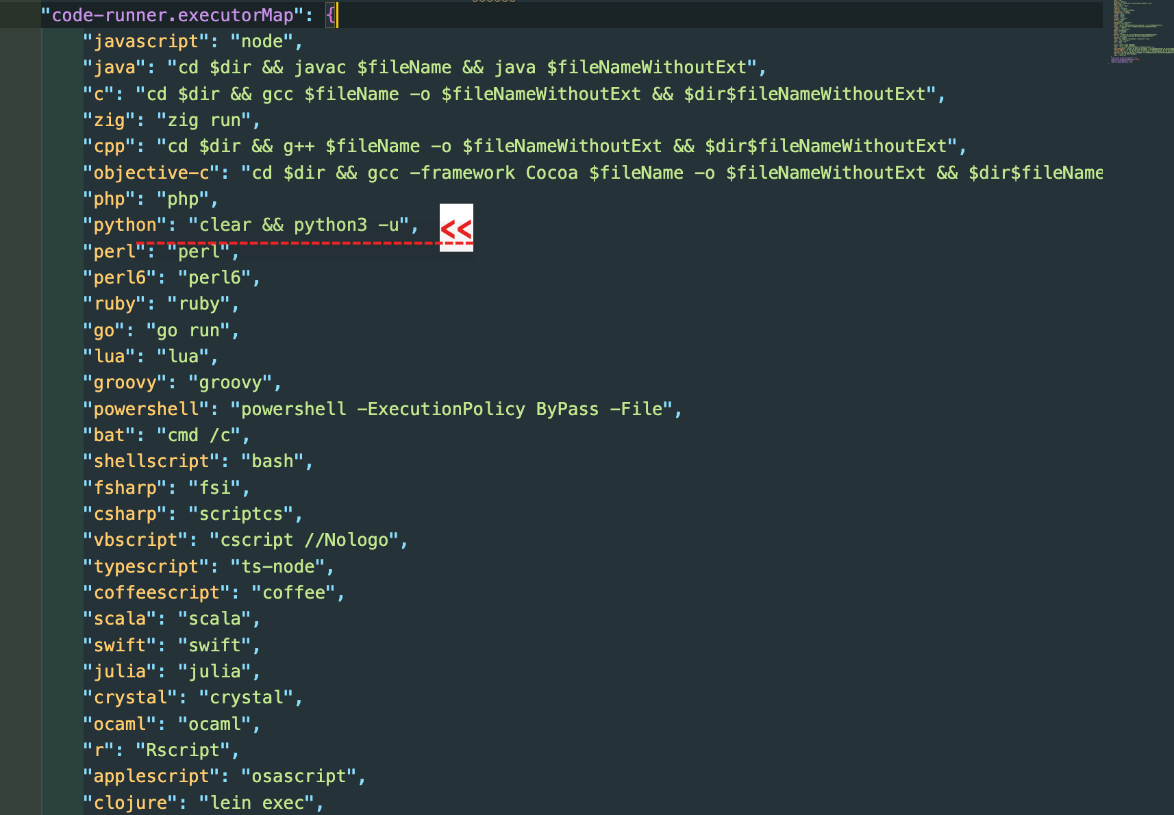"code-runner.executorMap" 이후에 수많은 프로그래밍 언어가 보일 것이다.